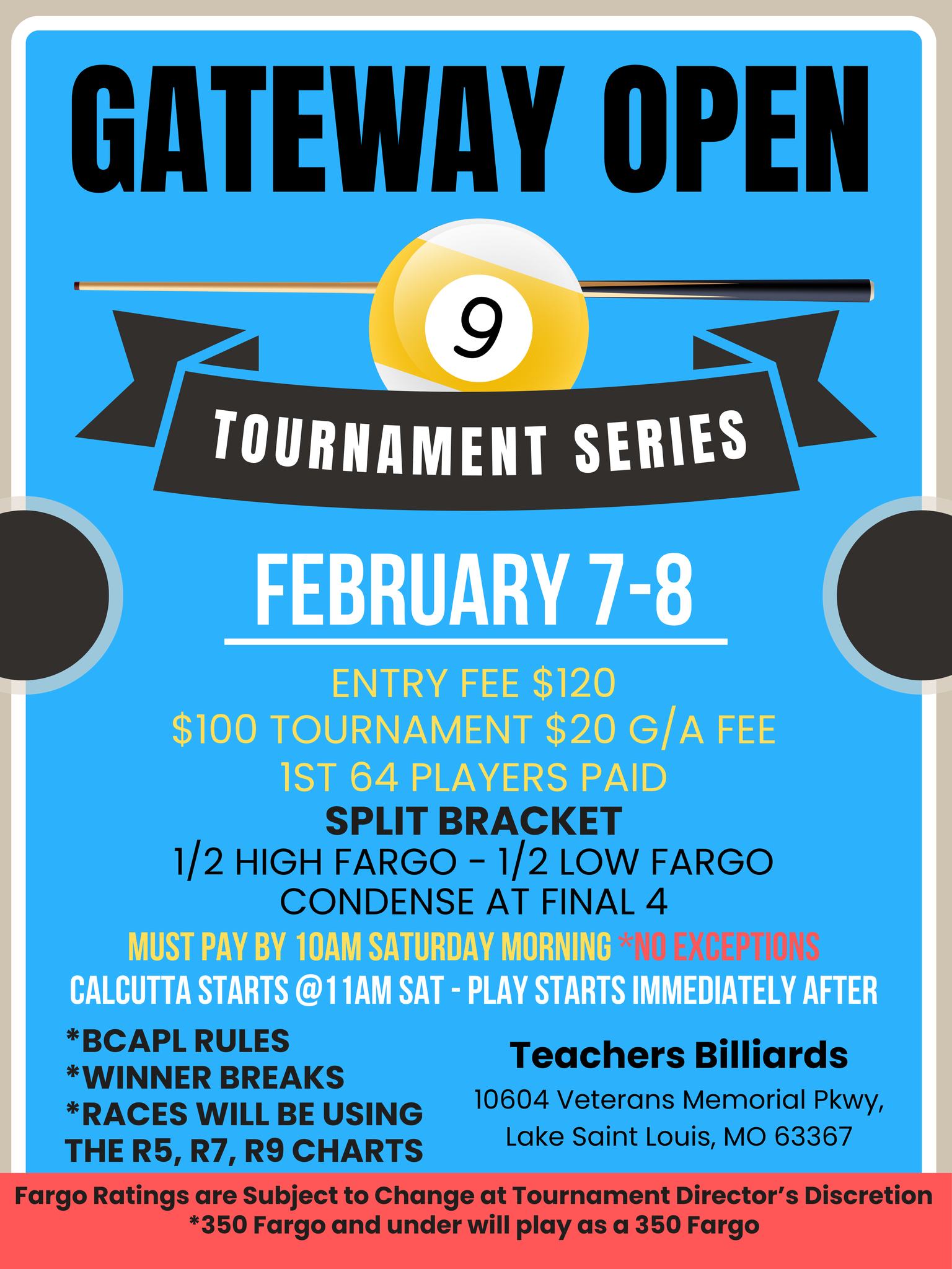 $100 Tournament + $20 Greens. Split bracket: 1/2 High Fargo 1/2 Low Fargo Condenses at final4. 64 player max, must pay before 10am Saturday morning **NO EXCEPTIONS** Play will continue Sunday morning, after closing hour Saturday night. Calcutta at 11am, play immediatley after. BCAPL Rules | Winner Breaks | R5/7/9 Charts Contact Justin Walsh on Facebook for more information and registration. |